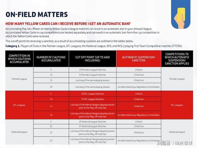 根據英超官網公布的規則,第19輪之前,得到5張黃牌的球員,需要自動停賽一場,第32輪之前,得到10張黃牌的球員,需要自動停賽兩場,整個賽季中,得到15張黃牌的球員,需要自動停賽三場,至于得到20張黃牌以上的球員,則要通過相關的紀律委員會做出相關的處罰。而且,累積黃牌停賽,只能在英超聯賽中執行,不能在國內杯賽接受處罰。