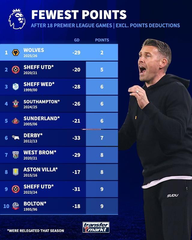 此前根據(jù)德轉數(shù)據(jù),在第18輪時,狼隊已經(jīng)創(chuàng)造了英超球隊前18輪的最低分紀錄,而這一榜單上所有球隊當賽季最終都降級。