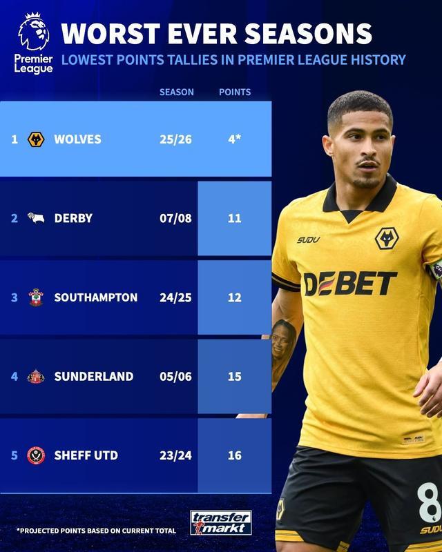 根據(jù)德轉的估算,他們認為狼隊本賽季最終賽季末得分僅有4分。而英超歷史上單賽季最低分得主為德比郡在2007-08賽季創(chuàng)下的11分。