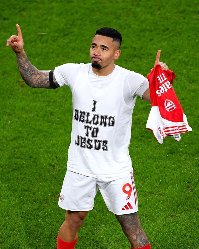 進球之后,熱蘇斯露出自己球衣里的內襯,而他球衣內襯上同樣寫著“I belong to Jesus”,不禁讓人聯(lián)想到米蘭傳奇卡卡當年標志性的慶祝動作。而熱蘇斯的名字更讓這句話有了“一語雙關”的意味。