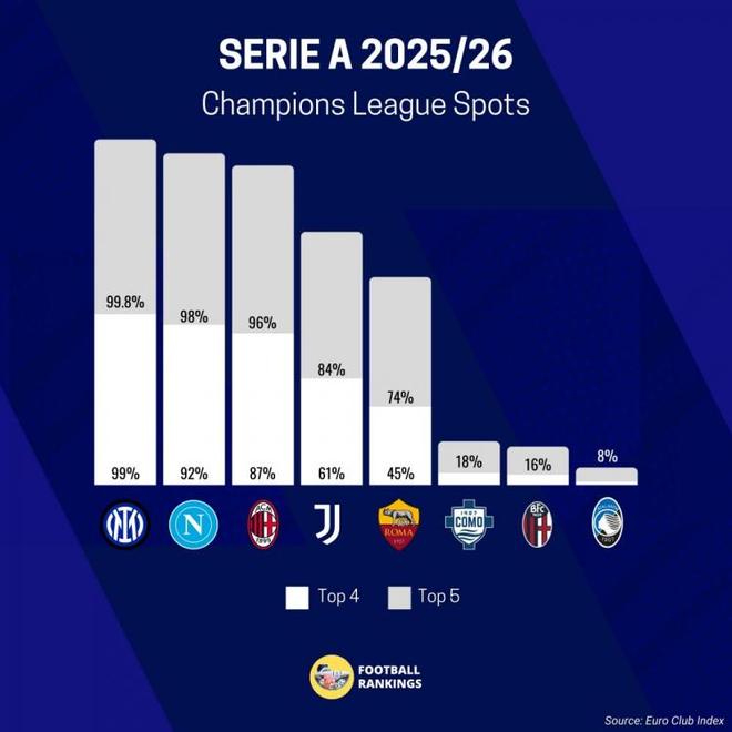 意甲方面的,目前有38%的概率獲得五個下賽季歐冠席位機(jī)會,F(xiàn)ootball Rankings對意甲本賽季前五預(yù)測如下的: