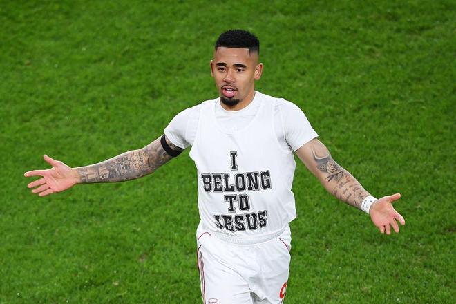 據《倫敦足球》報道,阿森納前鋒熱蘇斯在4-1大勝阿斯頓維拉的比賽中打進本賽季首球,隨后脫衣慶祝,露出T恤內側“I belong to Jesus”字樣,這一舉動可能違反英足總規則,或面臨處罰。