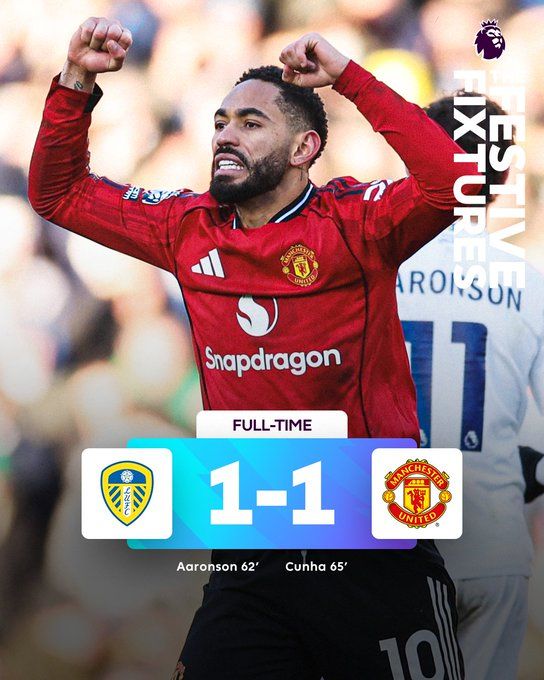 北京時間1月4日20:30,英超聯賽第20輪,利茲聯主場迎戰曼徹斯特聯。上半場,庫尼亞凌空遠射破門,但越位在先被判無效!勒溫頭球擊中立柱;約羅近距離頭球攻門被佩利撲出。下半場,阿隆森破門;齊爾克澤替補秒送助攻,庫尼亞扳平比分!奧卡福倒鉤被拉門斯神撲化解;齊爾克澤橫傳,舍什科門前推射失良機!最終,曼聯1-1戰平利茲聯,近5輪英超僅1勝。