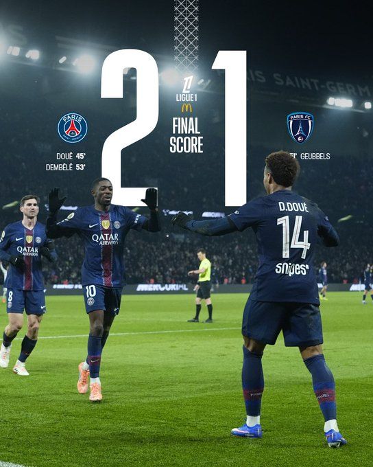 北京時間1月5日03:45,法甲聯賽第17輪,巴黎圣日耳曼坐鎮王子公園球場迎戰巴黎FC。上半場,法比安助攻杜埃首開記錄。巴黎圣日耳曼半場1-0領先巴黎FC。下半場,扎巴爾尼犯規送點,戈貝爾點射扳平,登貝萊破門。最終巴黎圣日耳曼2-1擊敗巴黎FC,距離榜首還有1分差距。
