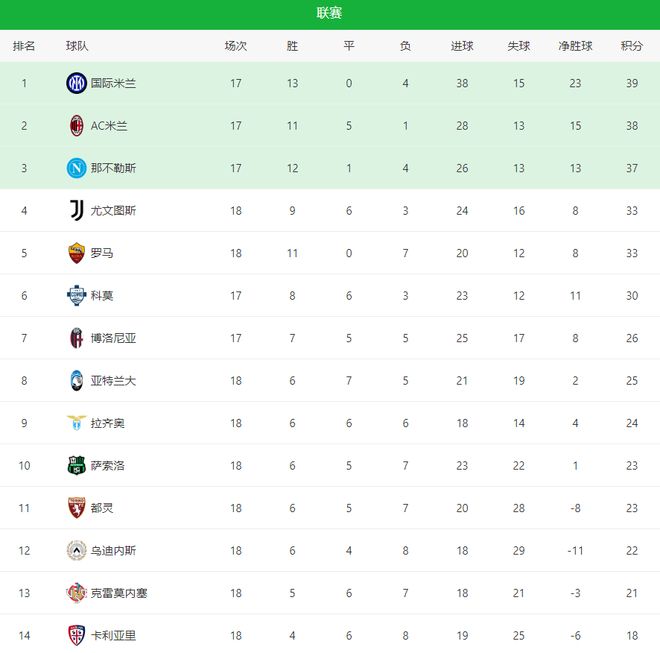 隨著本輪多場比賽結束,意甲積分榜呈現出清晰的三層結構:米蘭雙雄依舊領跑,那不勒斯緊追不舍,歐戰區與保級區的競爭則愈發殘酷。