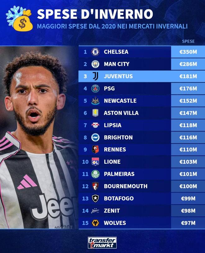 北京時間1月7日,德轉列出了過去5年冬窗引援支出排行榜,切爾西3.5億歐元高居第一,曼城2.86億歐元第二,尤文圖斯1.81億歐元第三。