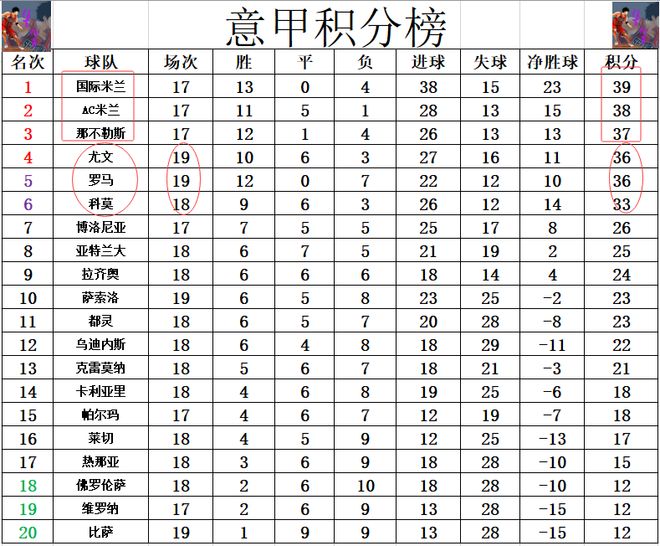 積分榜方面,國米,AC米蘭和那不勒斯的榜首競爭依然激烈,國米1分優勢力壓AC米蘭領跑,AC米蘭則是多那不勒斯1分位列第2。尤文,羅馬齊齊贏球,尤文1個凈勝球的微弱優勢力壓羅馬守住第4。黑馬科莫3連勝,少賽一場,只少羅馬,尤文3分,他們補賽要是能贏球的話,就能超過尤文,這第4的爭奪比榜首還要慘烈。