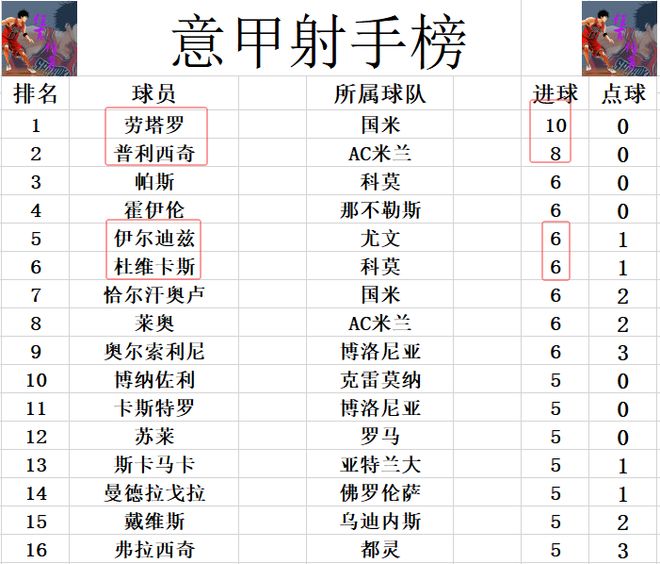 射手榜方面,勞塔羅10球領跑,普利西奇8球位列第2,伊爾迪茲今天錯失多次機會,被今天梅開二度的杜維卡斯追上,他們和霍伊倫,恰爾汗奧盧,萊奧,奧爾索利尼等人6球并列第3。
