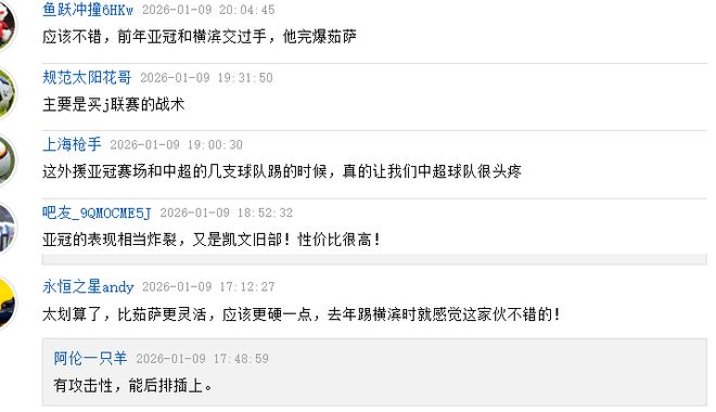 有球迷表示,才37.5萬歐,中超保級隊外援都不止這個身價了吧,這個年紀這個身價來中超第一名當外援,笑死誰呢!也有球迷認同這筆交易,評論區有球迷表示前年海港跟橫濱水手交過手時,他完爆茹薩。也有人指出他的亞冠表現相當炸裂,真的讓中超球隊很頭疼,性價比很高。